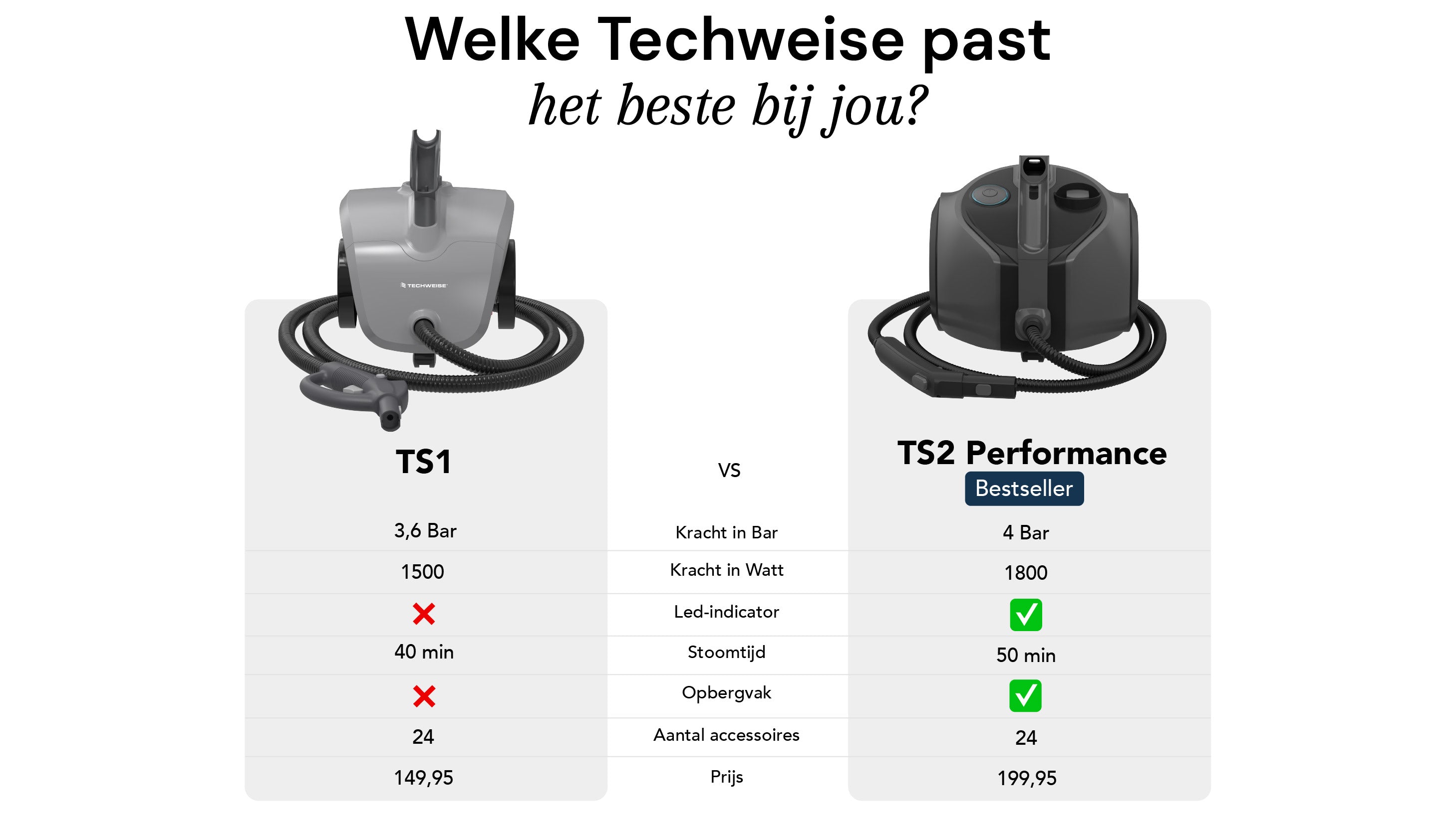 De TS2 Performance biedt meer kracht (4 bar, 1800 watt), een langere stoomtijd van 50 minuten en extra gemak met LED-indicator en opbergvak. Dit model is de populairste keuze.